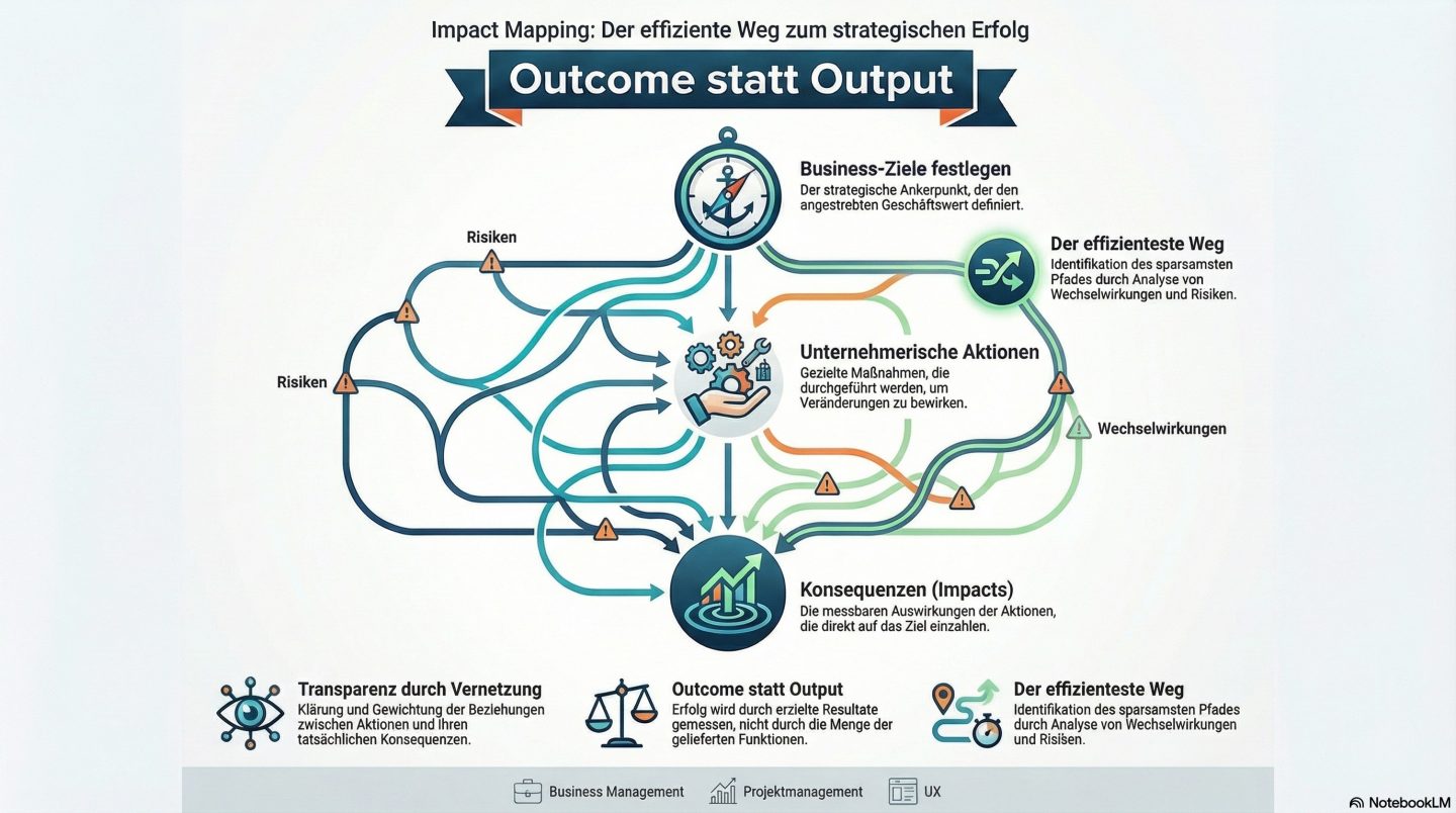 In einer komplexen Projektwelt verliert man sich leicht in kleinteiligen Aufgabenlisten. Hier setzt Impact Mapping an – eine strategische Planungsmethode, die dabei hilft, den Fokus nicht auf blosse Ergebnisse, sondern auf echte Wirkungen zu legen. Das Motto lautet: Outcome statt Output.